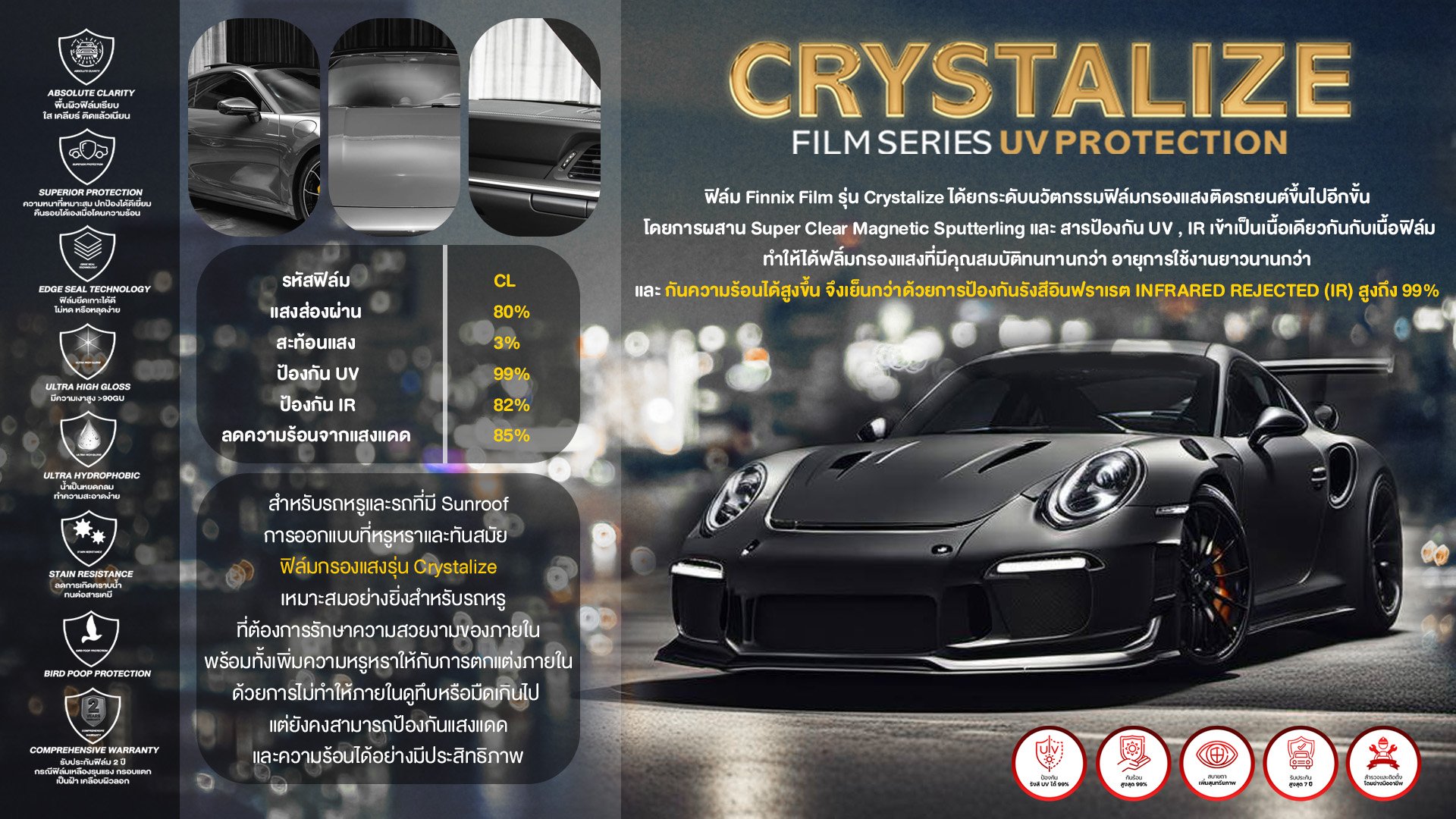 ฟิล์ม Finnix Film รุ่น Crystalize ได้ยกระดับนวัตกรรมฟิล์มกรองแสงติดรถยนต์ขึ้นไปอีกขั้น โดยการผสาน Super Clear Magnetic Sputterling และ สารป้องกัน UV , IR เข้าเป็นเนื้อเดียวกันกับเนื้อฟิล์ม